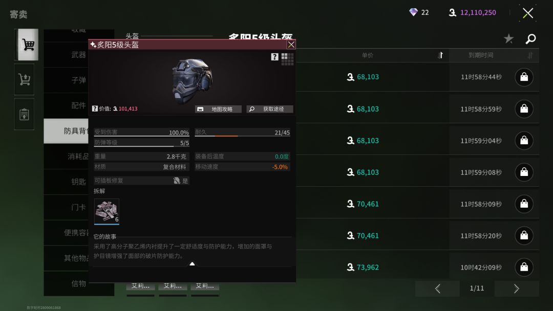 头盔选择较便宜的5级头,尽量连少被击中头部秒杀的情况,随着价格波动买即可。大概需要7w。