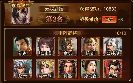 位居第三的是 无双剑姬 军团,以 10833 的优异成绩成功攻破 困难+3!