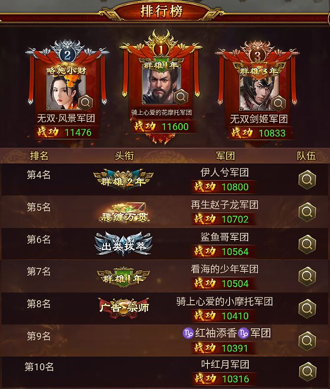 排行榜中,最终通关 困难+10 并拿下高战功的军团为:骑上心爱的花摩托、鲨鱼哥、骑上心爱的小摩托