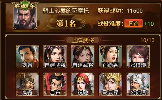 在本次小沛之战(新)中 骑上心爱的花摩托 军团以 11600 的战功摘得桂冠,通关战役 困难+10 ,恭喜!