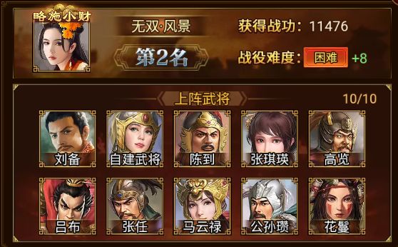 位居第二的是 无双·风景 军团,以 11476 的战功,成功攻破 困难+8!