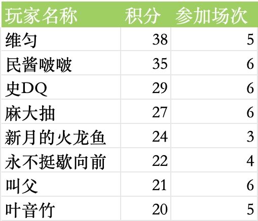 非常感谢大家的参与和支持。恭喜以下玩家获得额外奖励,他们的积分分别为:【维匀】 38分、【民酱啵啵】 35分、【史DQ】 29分、【麻大抽】 27分、【新月的火龙鱼】 24分、【永不挺歇向前】 22分、【叫父】 21分、【叶音竹】 20分,其他参与的玩家获得参与奖励。