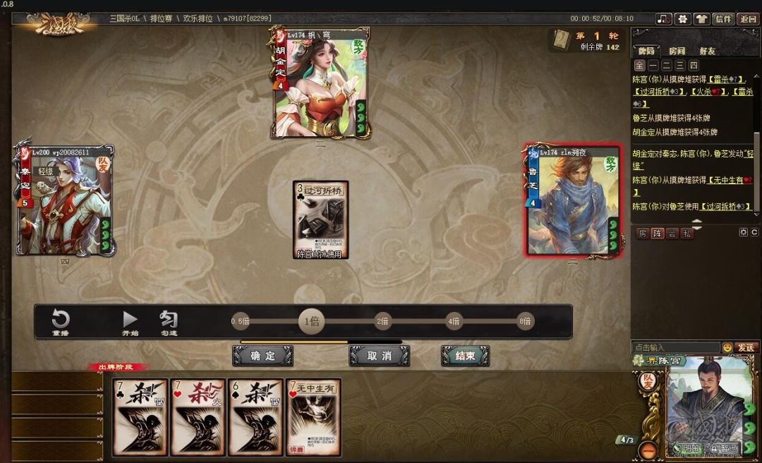 本局为22排位模式,对面是本赛季很厉害的胡金定。本方武将是界陈宫和秦宓,有一定的配合,开局手里杀比较多,但是没有距离。