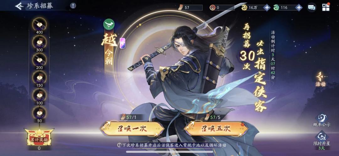 3. 珍系侠客的保底次数为30次,如果玩家连续29次未获得珍系侠客时,则第30次必定获得珍系侠客:若在30次之前获得珍系侠客,则剩余招募次数重置并重新开始计算保底次数。4.珍系侠客首次出现在珍系招募活动时,下次珍系招募开启前不在珍系招募活动外开启该珍系侠客的获取途径。
