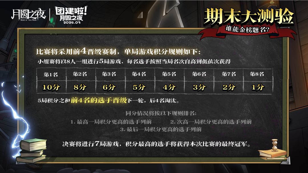 3月30日,《月圆之夜》S2赛季最后一次团建活动开启,所有玩家届时可以前往官方直播间观看比赛,也可以前往各大主播直播间支持你喜欢的主播,看看谁是三好学生,夺得期末大考头名!