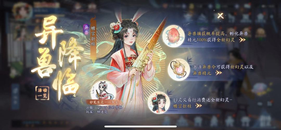 如果同时开启异兽令和幻灵月卡,可以再另外赠送一只蟾宫折桂。
