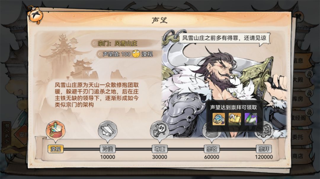 需要注意的是每个宗门都可以获得声望等级奖励,每个宗门的奖励也会有所不同,祖师可以根据自己所要奖励进行选择性攻略某个宗门的声望等级,小清瑶在这提示大家,天山地图里的风雪山庄宗门达到崇拜时可以获得橙色功法傲雪刀诀全篇哦。