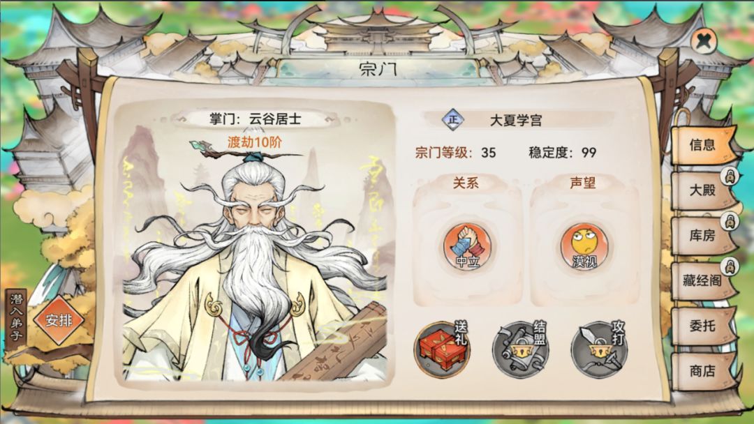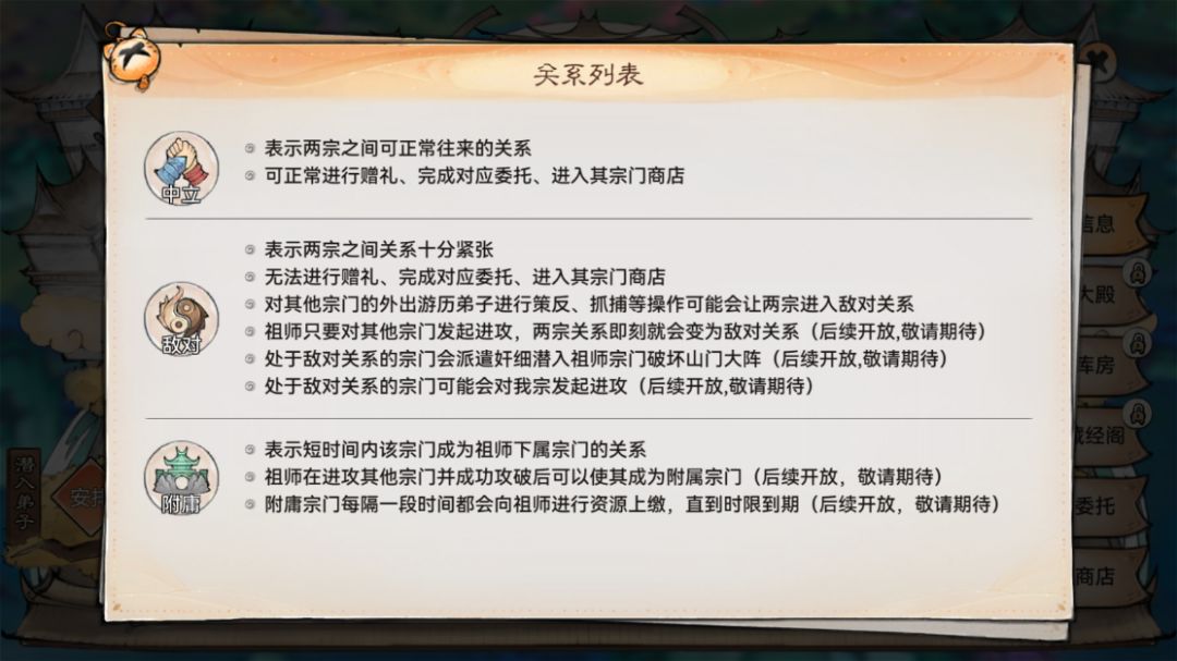 中立代表着正常关系,祖师可以对其宗门进行赠礼、完成委托、进入其宗门商店等操作。