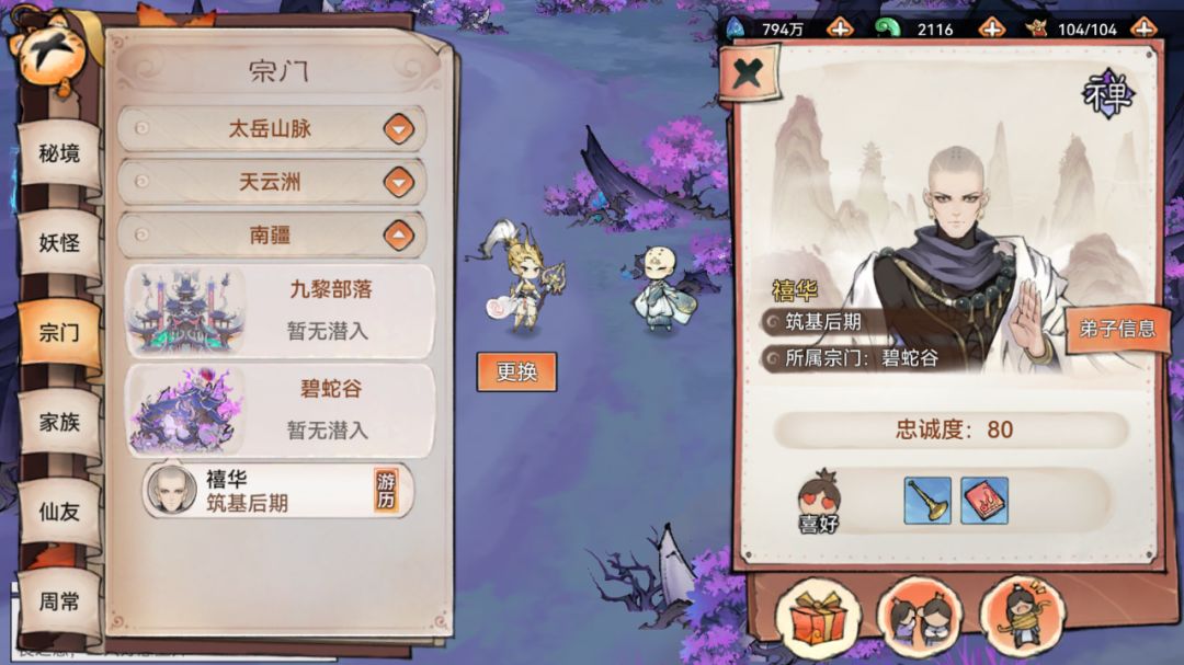 当然,除了我们主动去拜访其他宗门以外,其他宗门有的时候也会派出弟子在外进行游历,当祖师的宗门等级达到21级时,我们就可以跟这些世界宗门的外出游历弟子进行赠礼、策反、抓捕等互动啦~