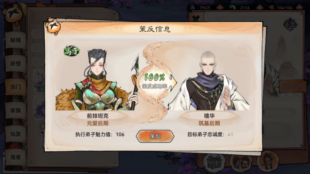 赠礼可以降低弟子的忠诚度,忠诚度越低策反成功率越高,当我们成功策反后,就可以将该弟子收入我们自己的宗门了,而抓捕弟子则是可以将之收入牢狱,规则是进行抓捕的弟子战斗力越高成功率越高。
