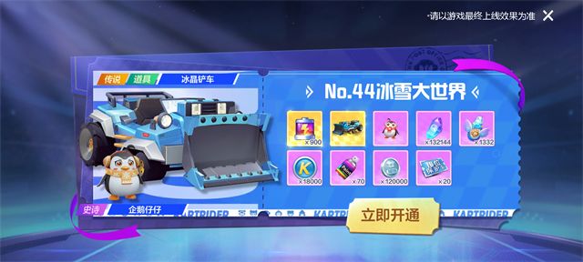 冰雪动力,扫除障碍,踏平冰晶,全新传说道具车【冰晶铲车】惊喜来袭!统治寒冷地带的危险霸主,全新史诗宠物【企鹅仔仔】搭档上场!