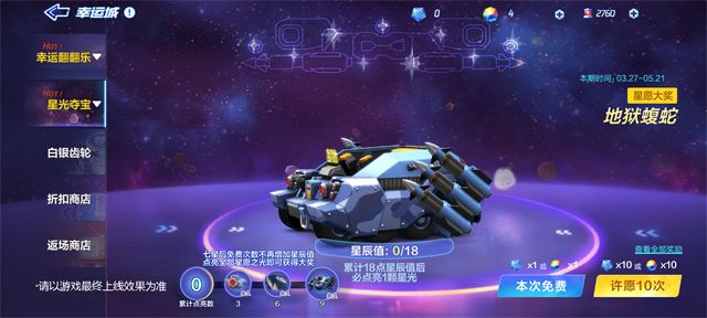 来自地狱的装甲王者,野性天然压制一切!3月27日起,全新传说道具车【地狱蝮蛇】在【星光夺宝】上线,天生紫电震慑掠夺!