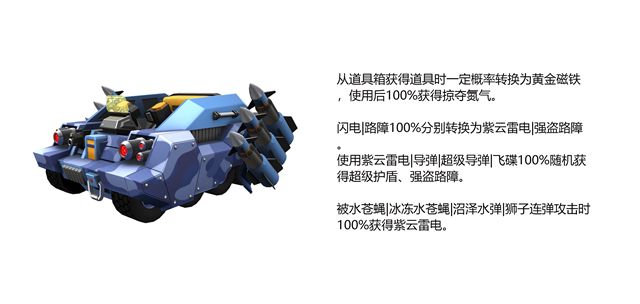 冰晶铲车铲除冰雪,能够积攒转化冰雪能量,将水炸弹转换为冰冻水炸弹,攻击前方的敌人还能高概率获取超级氮气,向前冲击!