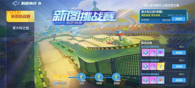 3月27日-4月9日还将开启新图挑战赛,车友们完成新图挑战,即可获得奖励和积分。奖励包括时间沙漏、紫色幸运币和橙色幸运币,其中积分可用于兑换酷币。