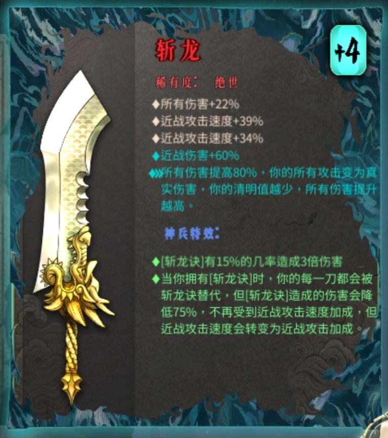 BD原理:红色品质斩龙武器+金色技能斩龙决,【攻击速度】加成将转换为【近战攻击】加成,近战面板获得极大提升,同时斩龙决的范围让平A清图也毫无压力。