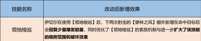 在本次更新新增【穿林之风】命中目标会额外回复少量爆发能量后,一定程度上解决了上文描述的伊切尔对于爆发能量难以获取的问题,并优化了高频技能和核心技能的负循环的情况。在E(施展【领地梭巡】)-A(射击【穿林之风】)-A(射击【穿林之风】)的操作下能回复的爆发能量较为可观(目前一发【穿林之风】约可提供2点爆发能量)。