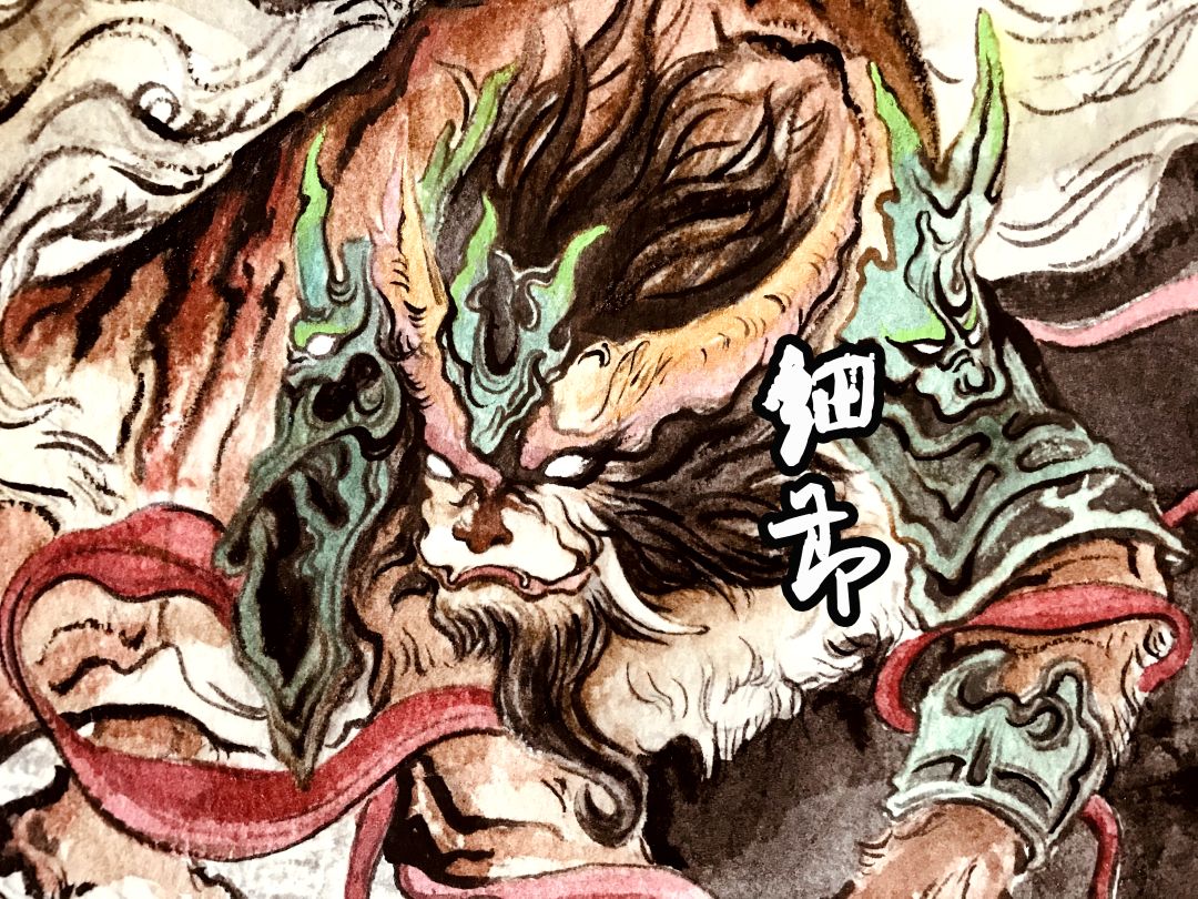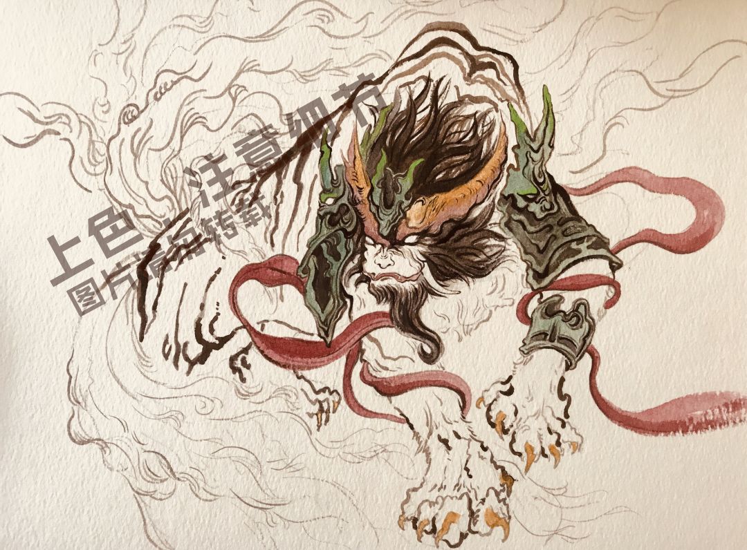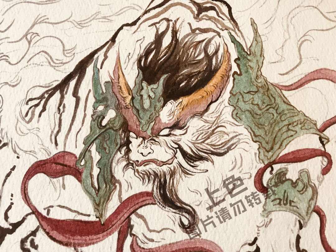 最后完成就是这样啦,九尾隐隐约约,毛发绘画时,需要自然,用笔流畅,陆吾踏昆仑山之绝顶,所以脚下是雪白的地面