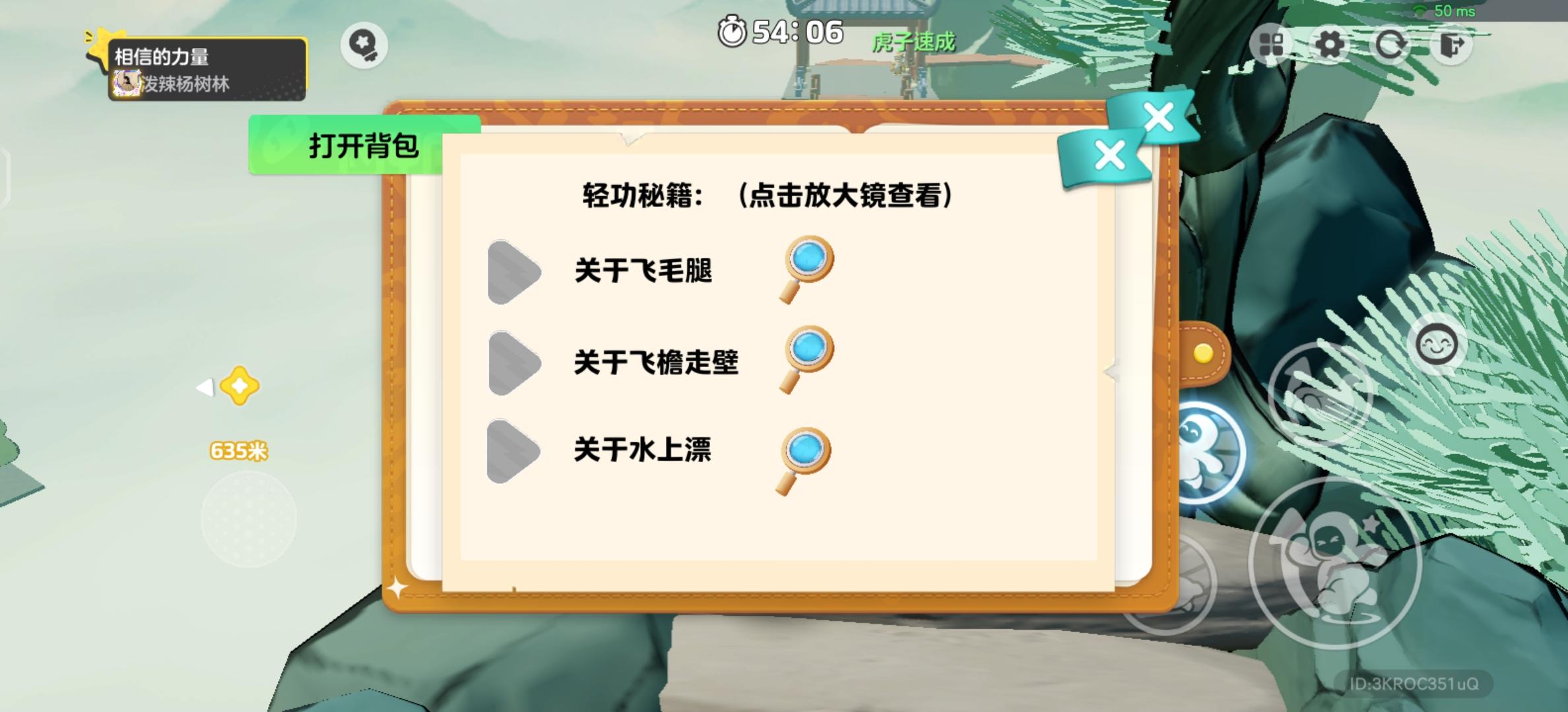 打开背包使用轻功秘籍,点击放大镜就可以查看详细内容啦~谨记秘籍中提到的要领后继续向前,星宝们马上就有机会练习了o( ̄▽ ̄)d