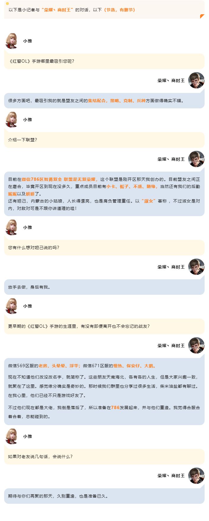 本次访谈嘉宾“荣耀丶商纣王”经历几度隐没复出,终于在微信786区-智勇双全创下了属于自己的联盟“无双荣耀”,彻底在这片土地扎了根。他的游戏目标明确,就是在新服与新的战友们偕同发展自身,在无尽的成长路上等一群人,等那些曾与他并肩同行、而今或许超出他太多的故人。他期待着以后相遇,有人能够再次喊出他最初的游戏名称——“伊人”。