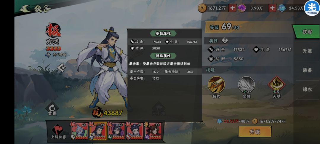 方鸿的倍率为151%,此时暴击点数为1179