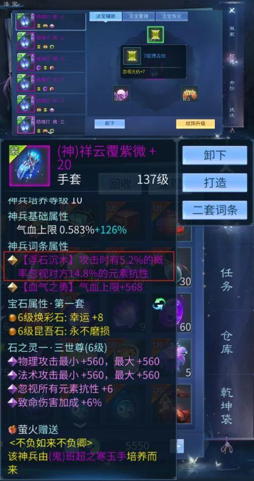 所以基本上在装备词条的选择上,能带命中敏捷的尽量去堆高。输出魅者在戒指的打造方向一定要选择高级鬼装,词条上最好带强混+不修/无钻,比如固定强混再去洗一个不修/无钻,如果有条件打6级昆吾石也可以选择双50的词条更好。在新装备暗器的选择上尽量去洗出福佑或者逆天属性加强你的法术强度,如有条件的玩家可以选择逆天带有效克职业属性最佳。