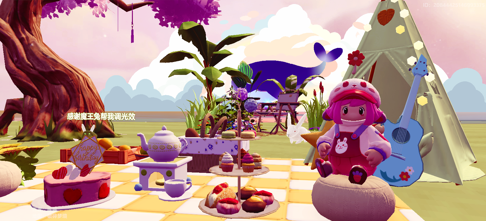 第五层梦境是春日野餐的场景。和三五好友一起坐在野餐垫上,弹弹吉他,吃吃下午茶,还有小兔子相伴,远处的天空中蓬松的云朵和鲸鱼同游......这种惬意放松的时刻当然要记录下来,留存记忆啦~坐在野餐垫右侧,选择【航拍】模式,可以让镜头左移,把樱花树圈进框内!