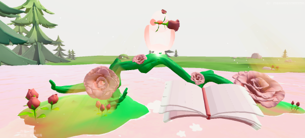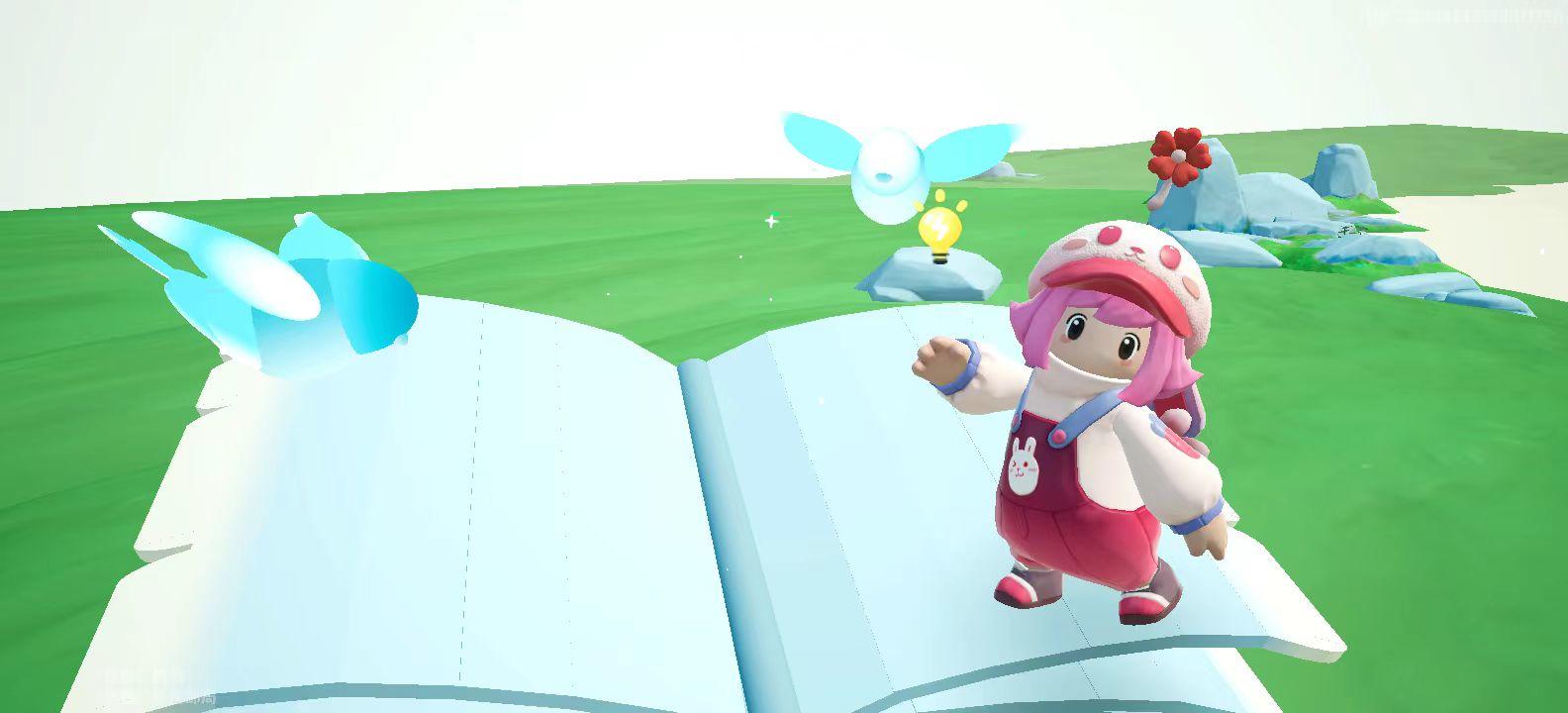 引入眼帘的是满眼的绿意,草坪中间有小河川流而过,河岸两边零星点缀着小雏菊花,还有飞舞的蓝色小鸟。地图贴心的箭头配合相机给星宝们标识了最佳拍照打卡点。星妹从善如流,在书本前摆出思考的造型!