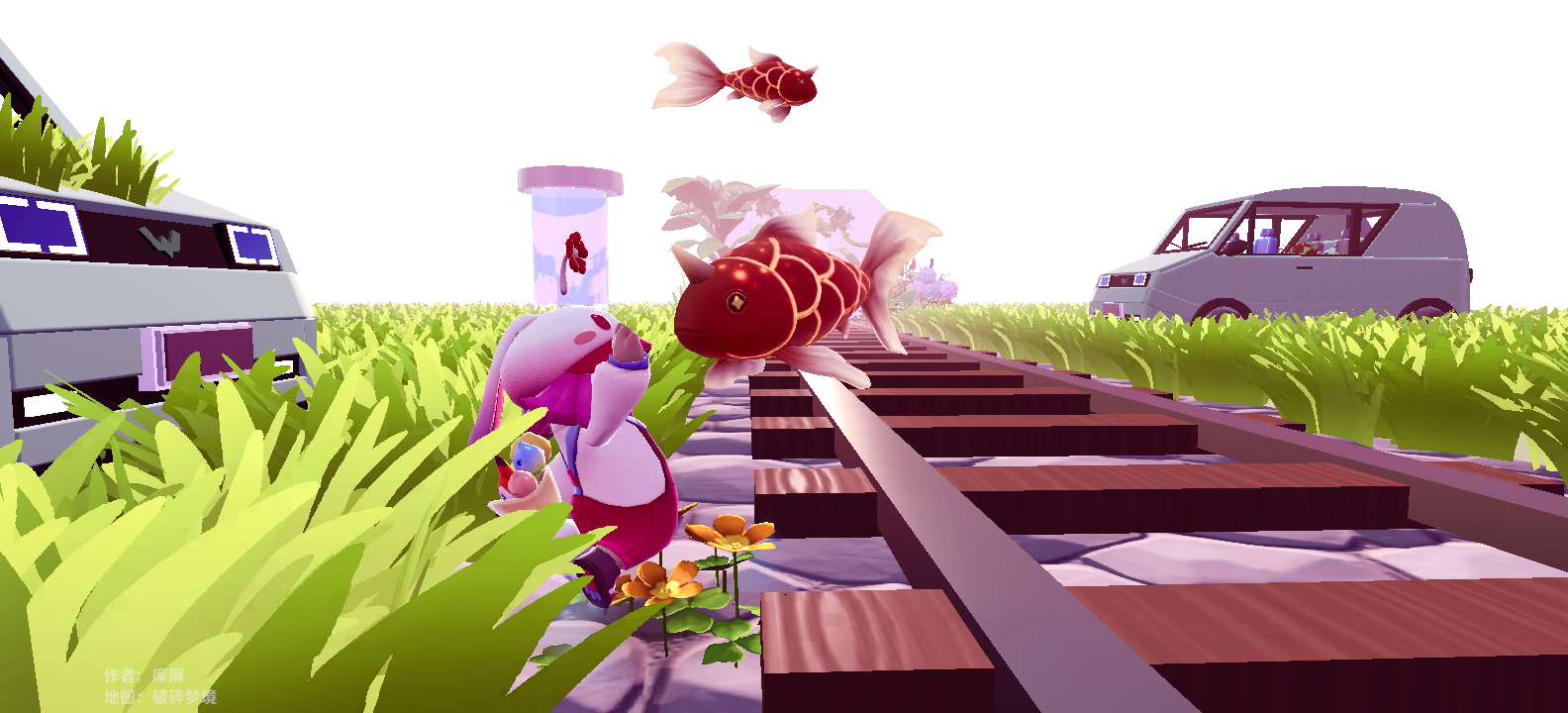 粉色河流的尽头是第三层梦境——游鱼铁轨!这是一片白茫茫的世界,站在铁轨尽头向远处望去,巨大的金鱼在半空中游荡,铁轨旁的草地郁郁葱葱,星妹甚至一时之间有点分不清楚自己是在陆地还是海底啦~