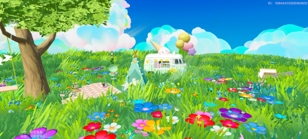 视角再次转换,远处巨大的粉色蝴蝶在朝星妹打招呼,草地上还种着粉色郁金香,地上的追光好像在告诉星妹这里是每个星宝的独家舞台哦~在这里星宝也可以体验一把变成蝴蝶的感觉,背起蝴蝶小翅膀,完成华丽COS!(别忘了记录精彩瞬间~)