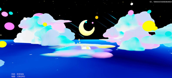 起点处的天空被糖果色的梦幻云朵装点,脚踩着泛着点点荧光的深蓝色大海,向着远处弯月高悬的地方前进。