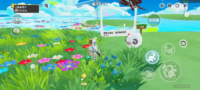 花丛中有备好的风筝,徐徐春风吹过,可爱的小羊跟着星妹一起在花田中穿梭, 正是放风筝的好时节~