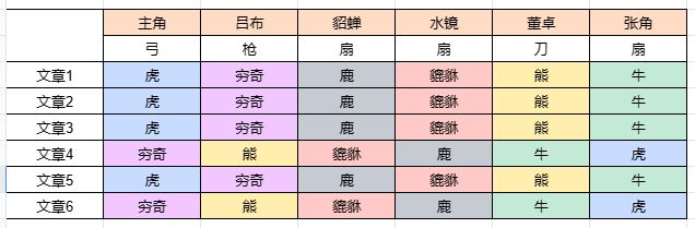 每个种类的文章分6个部位(1.2.3.4.5.6),对应每个武将的6个可装配位置。
