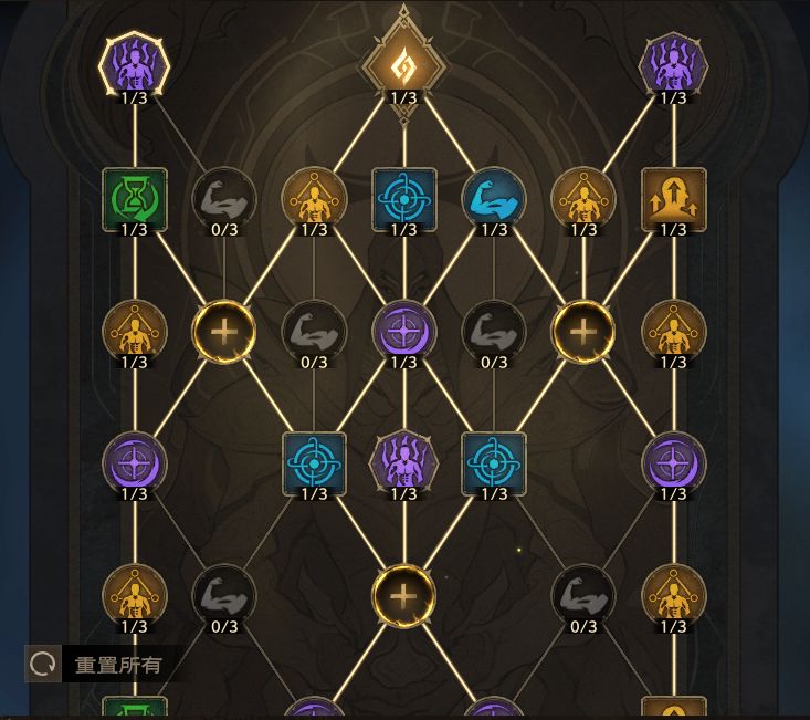 然后在全部节点都加完后,根据需求,比如我想偏斜(连击)卡在42% 或者冷却(全能)卡在10%(5%)之类的,将剩余的点数分配到其余节点上。