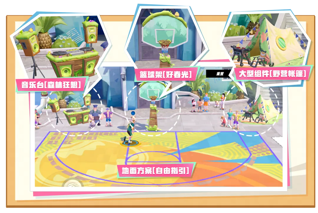 个性化球场新添4个春日主题组件:地面方案[自由指引],大型组件[野营帐篷],篮球架[好春光],音乐台[森林狂想]。绿意盎然,枝叶丛生,换上新装饰,享受在森林海洋中打球的乐趣。