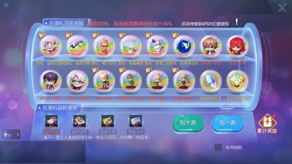 3月28日更新后至4月25日更新前,扭蛋机开启限时回馈!首周座驾抽取概率提升30%!