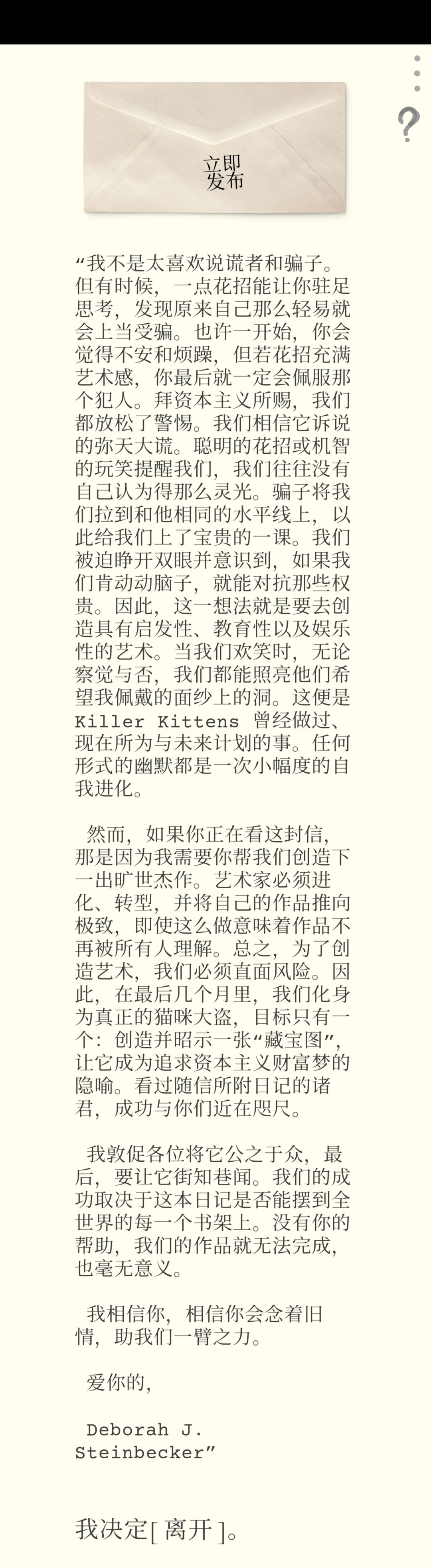 第三个,第七章,在厨房(点击 甜 字)找到一把钥匙,可以打开大厅的[中间的门],然后就会出现一封信,内容如图