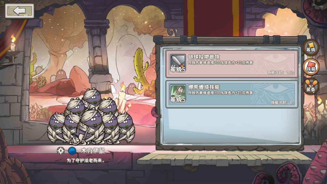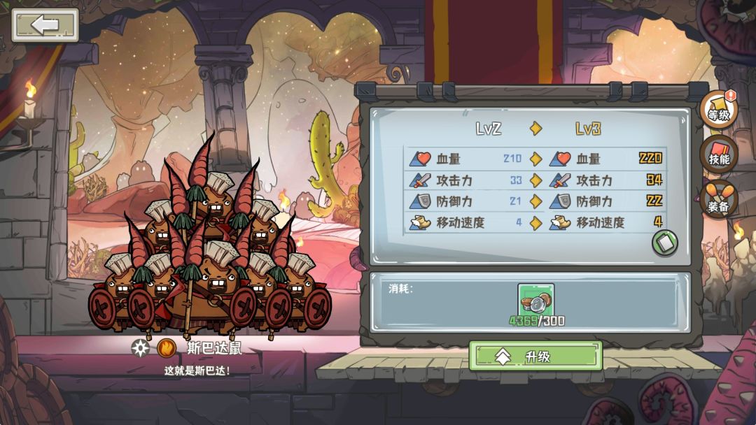 升级技能则更需要各位将军,认真考量想要打造鼠兵军团的侧重点,是想主要养成普攻,解放双手看谁打谁,还是强练技能,极限操作指哪打哪儿!