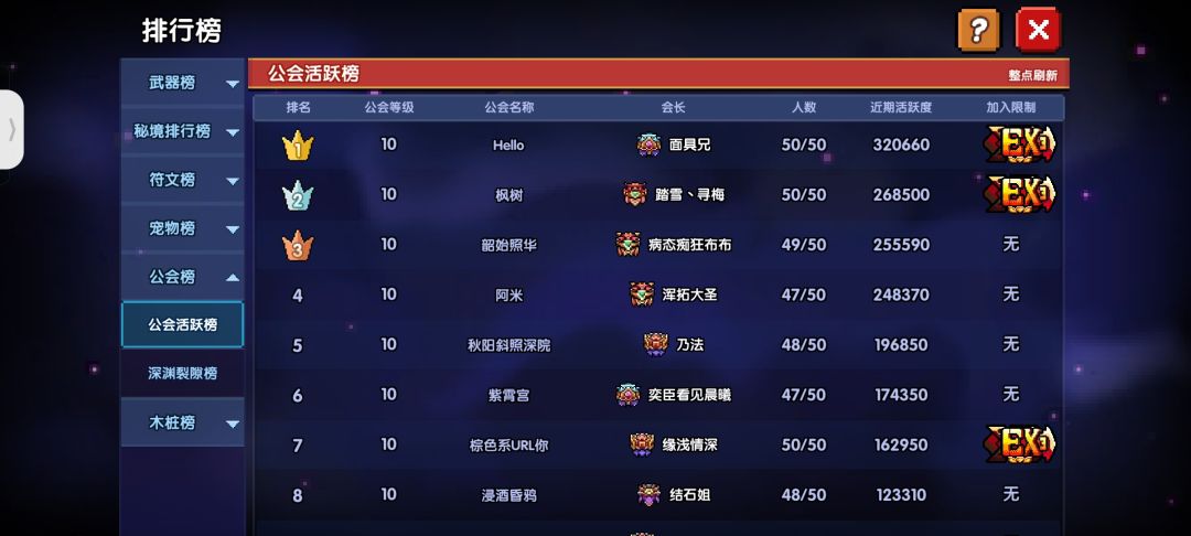 三个月左右,公会慢慢的发展了起来,活人越来越多,参与世界的人也越来越多,大家开始积极的做辅助,然后在经历了一次合区后我开始和别的公会谈合会,和西风火花骑士团合会后改名枫树,从一个探险都完不成的小公会变成了探险第一的公会,前不久和云顶之巅合会后现在裂隙已经达到了11秒结束。未来可期,我们永远在路上……
