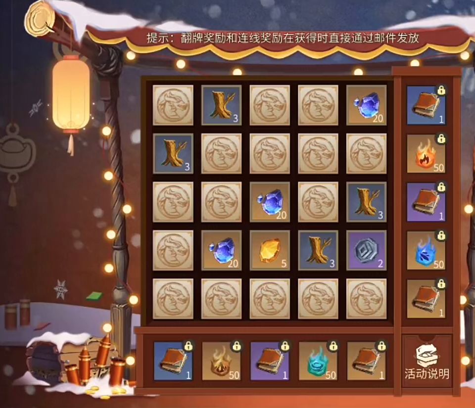 幸运连连活动登场,玩家通过使用钻石即可进行翻牌,通过翻牌可以获得奖励,同时达成一定连线条件也可获得对应的连线奖励,奖励非常丰厚!