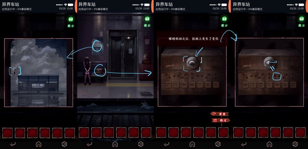 点击座位上的箱子,依次调整眼球转动方向后查看墙壁上的挂画,根据出现的符号依次调整,打开箱子。