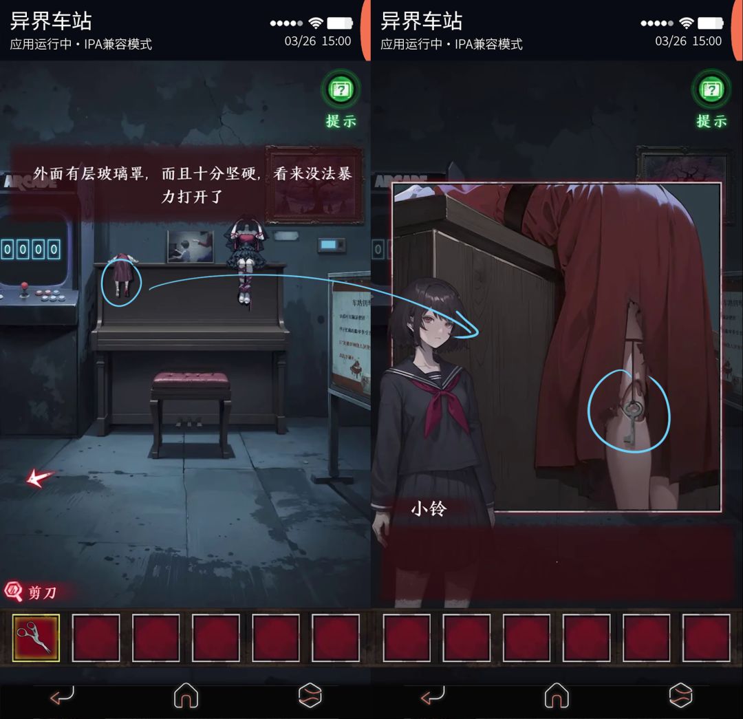 用获得的剪刀剪开钢琴左侧人偶的裙子,获得小钥匙。