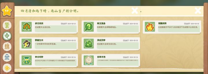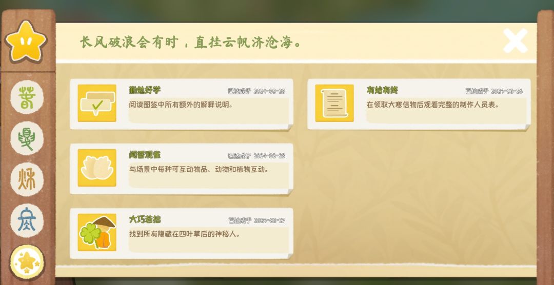 3.隐藏任务《大巧若拙》,每个季节地图上都有四叶草,找到四个四叶草就好了,找到四叶草得点几下,让官方人员出来唠两句就好了。