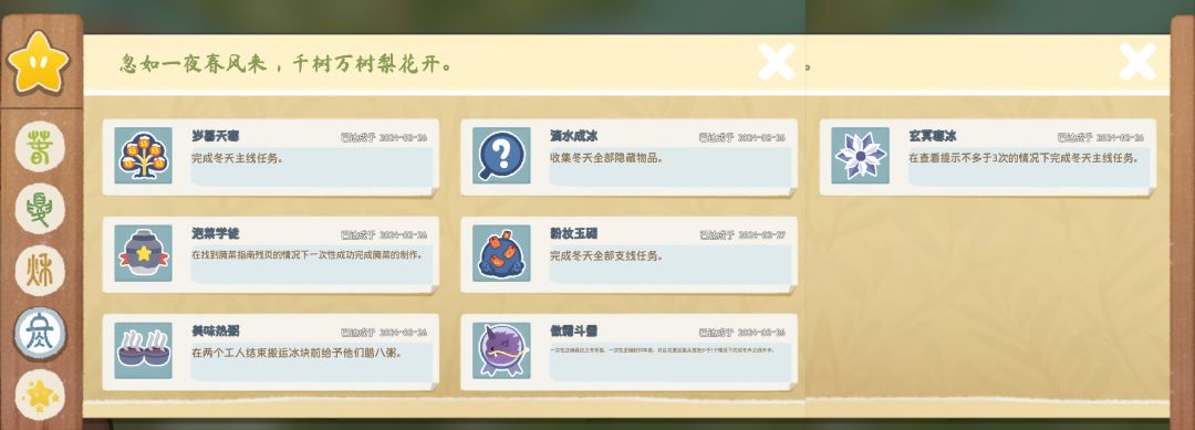 2.冬季的全部支线《粉妆玉砌》,主要是打败年兽之后,找到剪刀去地图左下角的女孩获得《春》字剪纸,再把剪纸送个右上角的男孩就好了。