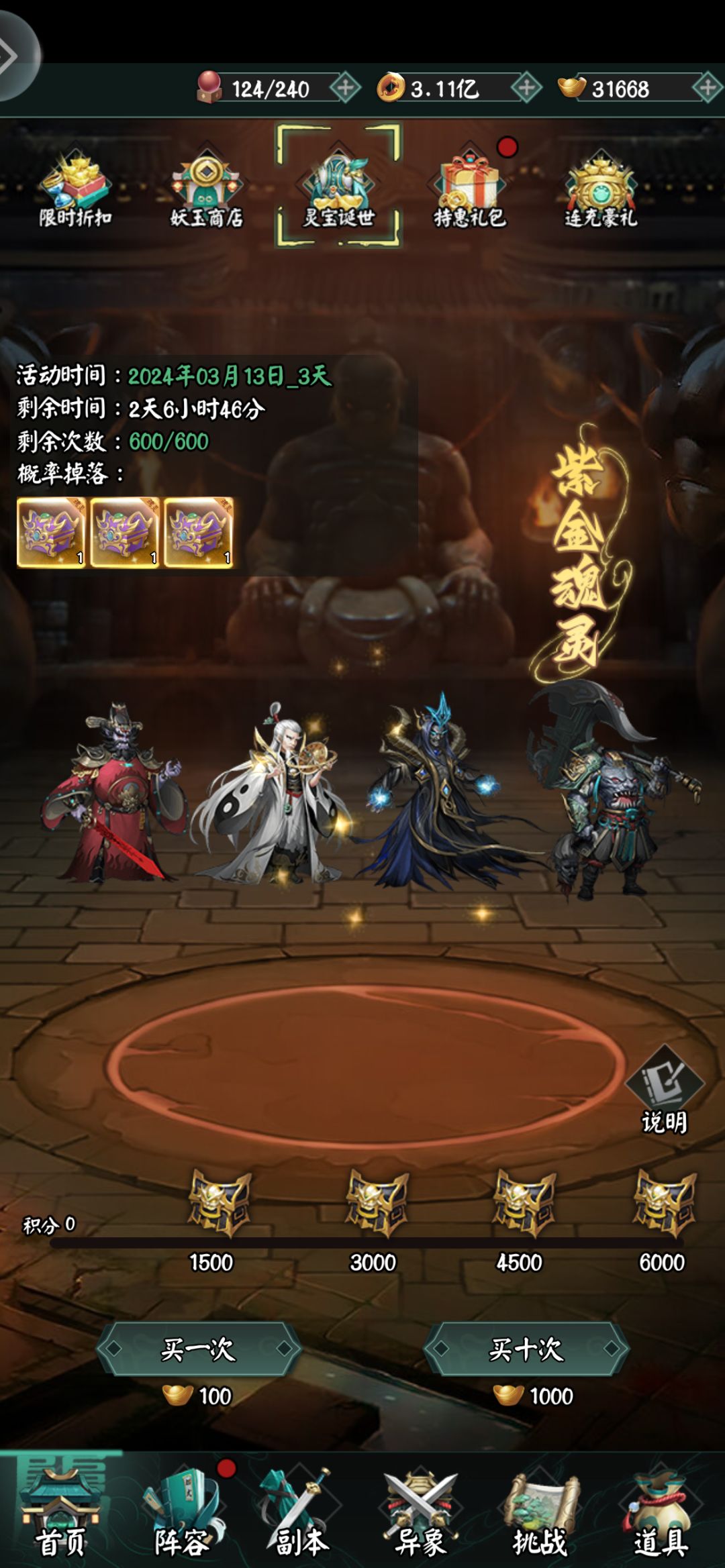 新手期7天会赠送紫金1和2魂灵。紫金2魂灵强度很低,就上阵即可,不用培养。如我树妖篇攻略中所说,新手需要抽新手魂灵灵宝,一直升星聂小倩,而毕业树妖后如果想选择其它种族,也可能花费1000元宝进行种族转换。之后能够获得紫金3和4的本体。新手一个月接入节日活动,在魂灵期的节日折扣中能购买到能白嫖到的最高等级魂灵(目前是幻彩1),然后作为主C进行极限培养。此时,就组成了最高系列白嫖魂灵(幻彩1)、紫金4、紫金3、紫金2、紫金1的阵容。