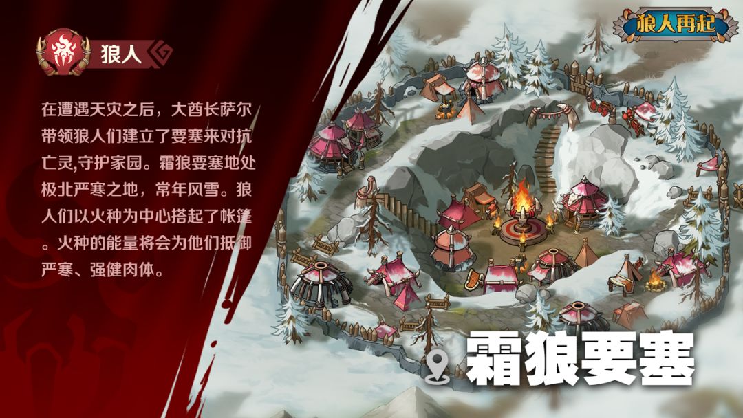 城市介绍:在遭遇天灾之后,大酋长萨尔带领狼人们建立了要塞来对抗亡灵、守护家园。霜狼要塞地处极北、严寒之地,常年风雪。狼人们以火种为中心搭起了帐篷。火种的能量将会为他们抵御严寒、强健肉体。