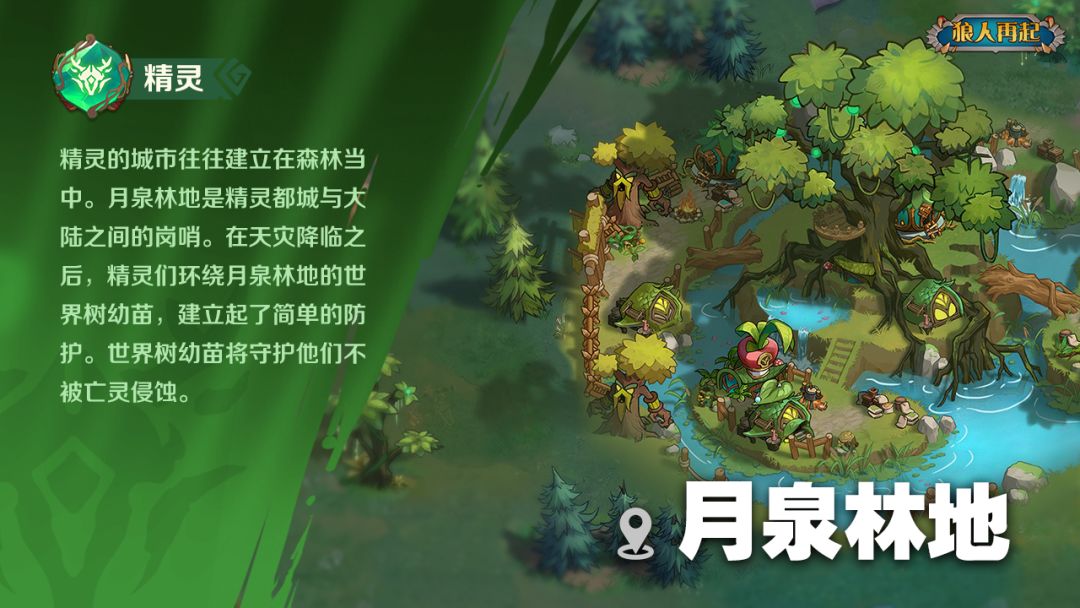 城市介绍:精灵的城市往往建立在森林当中。月泉林地是精灵都城与大陆之间的岗哨。在天灾降临之后,精灵们环绕月泉林地的世界树幼苗,建立起了简单的防护。世界树幼苗将守护他们不被亡灵侵蚀。