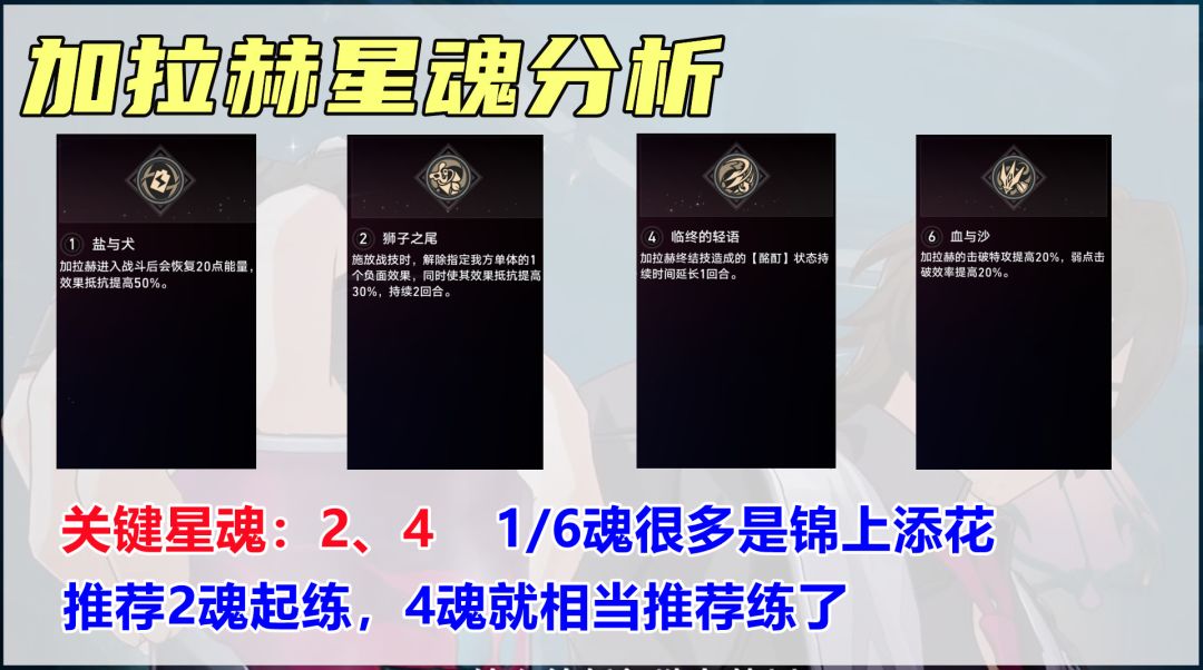 【星魂分析】加拉赫最关键的两个星魂是2和4,2魂让他有了解控能力,4魂则是能做到酩酊debuff理论全覆盖。至于1魂的20点能量和50%抵抗,以及6魂的20%击破特攻和弱点击破效果,更多是锦上添花。一般推荐加拉赫有2魂起练,4魂的话就相当值得练了。
