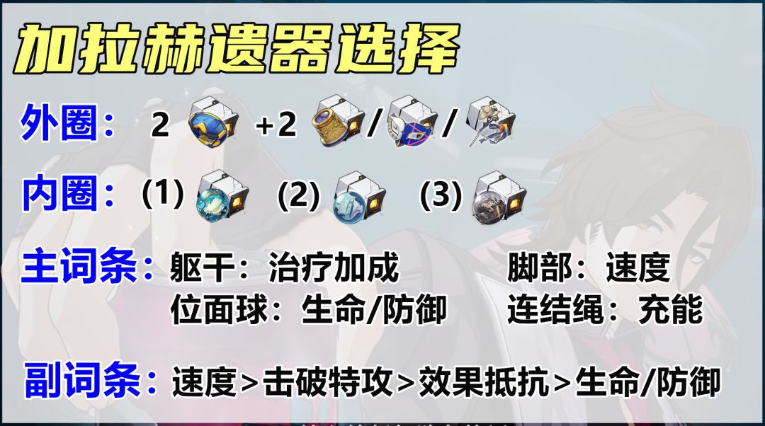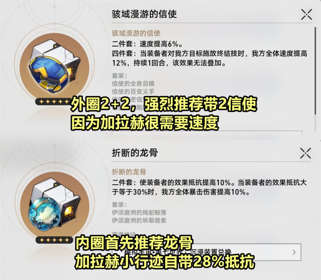 【遗器选择】外圈推荐2+2散搭,首选2信使,前面说过加拉赫很需要速度,另一半的散件可以是2击破或者2过客。内圈推荐三套,龙骨、仙舟或者盗贼公国塔利亚。个人更推荐龙骨套,因为加拉赫小行迹就自带28%效果抵抗,哪怕副词条不带一点抵抗,加上龙骨套的10%必定能触发暴伤加成效果。
