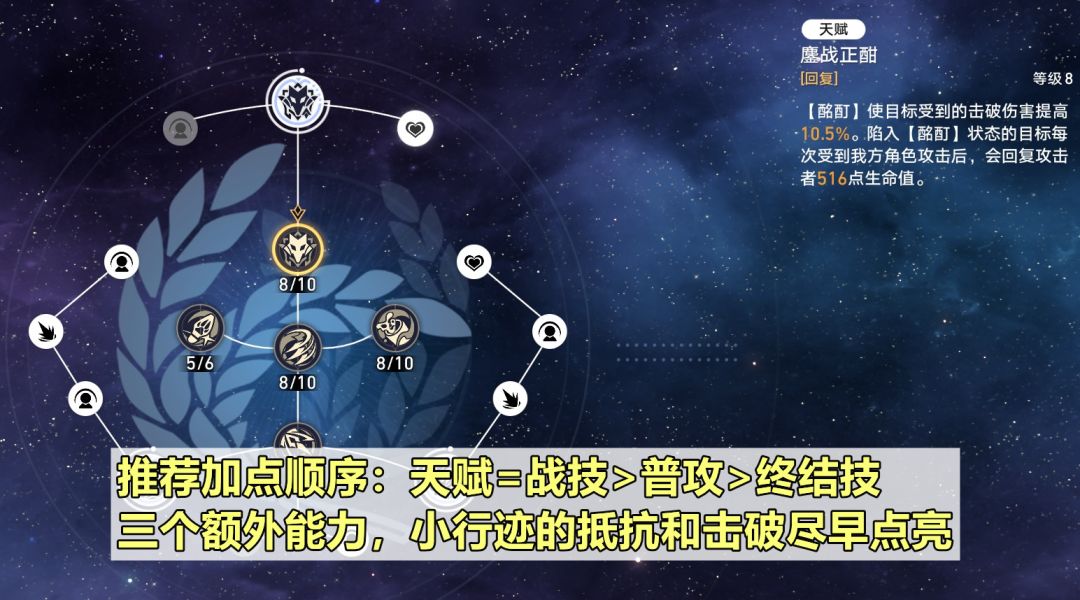 【技能加点】推荐加点顺序:天赋=战技>普攻>终结技,天赋和战技都对应加拉赫的回血,天赋还有击破易伤。至于普攻和终结技,升级提供的直伤加成作用不大,因此都可以不升。行迹方面,三个额外能力,以及小行迹的击破特攻和效果抵抗推荐尽早点亮。