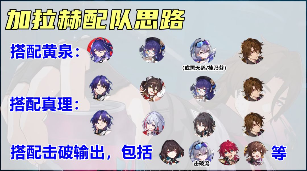 【配队思路】因为能挂debuff,所以加拉赫相当适配黄泉和真理医生这两位主C。搭配黄泉的话配队为黄泉+佩拉+银狼+加拉赫,银狼替代可选黑天鹅或者桂乃芬。搭配真理医生有两种配队,一种是相对低配的单C,真理医生+停云+佩拉+加拉赫;另一种是高配的双C追击队,真理医生+托帕+阮梅+加拉赫。最后是作为泛用生存位,搭配主打击破的输出,比如雪衣、击破银狼、卢卡、素裳等。